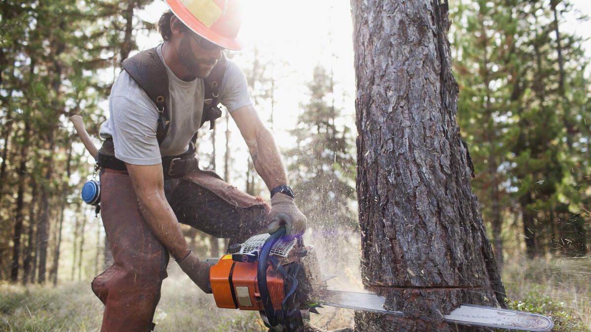 If there are rules about felling a tree that's next to a house...this guy didn't follow them. He's going at it with a chainsaw, and then steps back just in time to watch it crash down on top of his house.